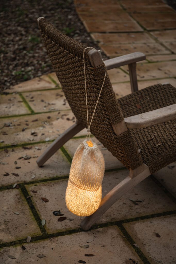 The Coccola collection takes center stage. These lamps are woven from hand-spun fique fiber on a manual loom built by artisan Albeiro Camargo, reviving an ancestral technique of the Guane people, his Indigenous ancestors. This cordless, portable table lamp with a rechargeable LED bulb brings light anywhere, creating intimate, warm, and enveloping atmospheres.