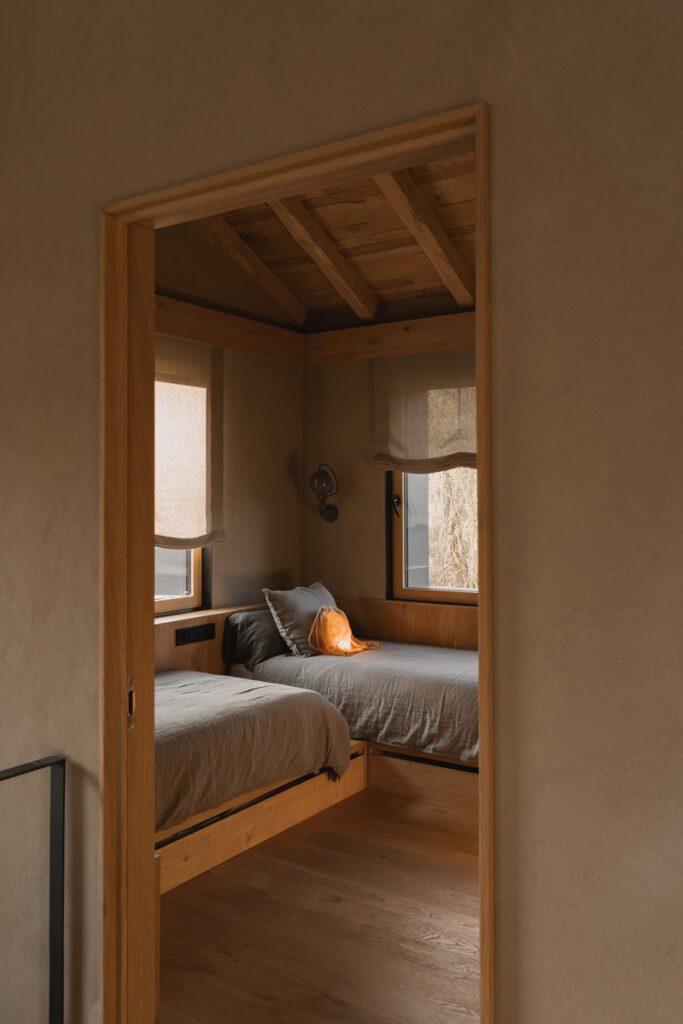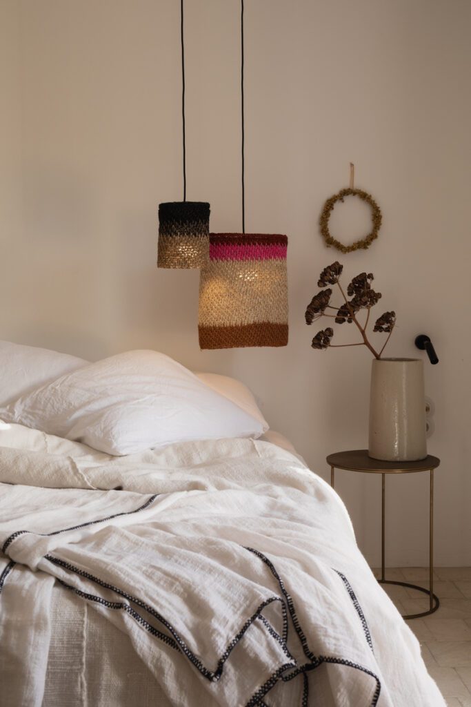 Las lámparas Colibrí, tejidas en fique con combinaciones cromáticas inspiradas en el plumaje de estas aves, aportan vitalidad sin romper la calma del espacio.