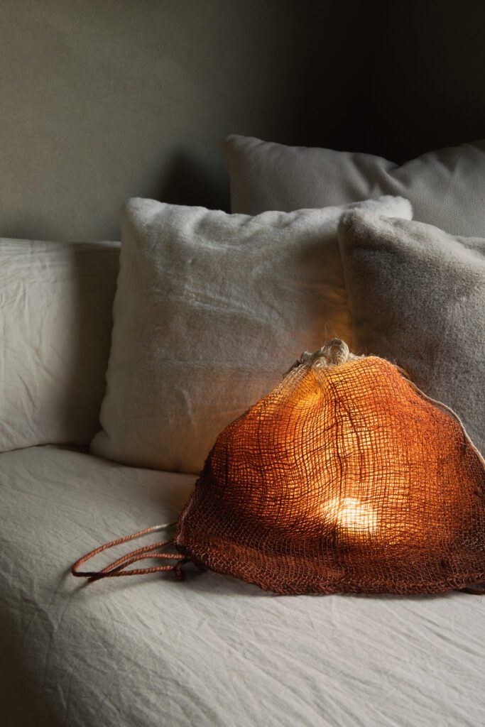 Olvídate de luces frías. La iluminación del lujo salvaje es suave, cálida y envolvente, con sombras que bailan como pequeñas fogatas. Para lograrlo, prioriza lámparas con pantallas también de fibras o materias orgánicas. Nuestra colección Couro, creada a partir de una hoja de palmera colombiana, es un must: pura naturaleza convertida en escultura lumínica y el máximo exponente de esta estética exquisita y del upcycling natural.