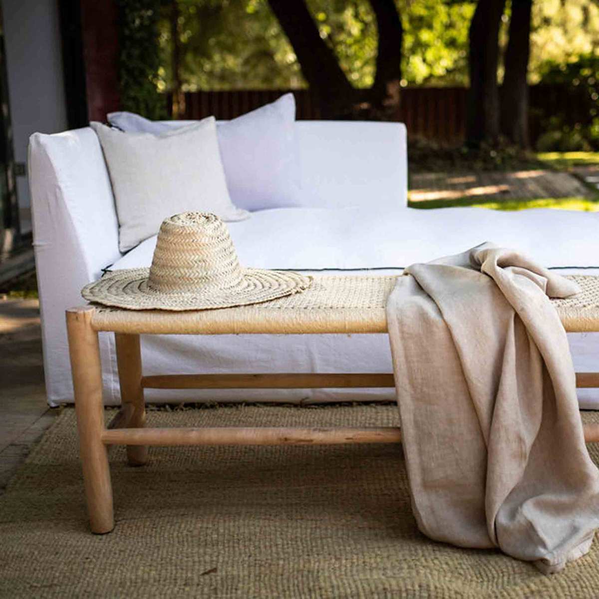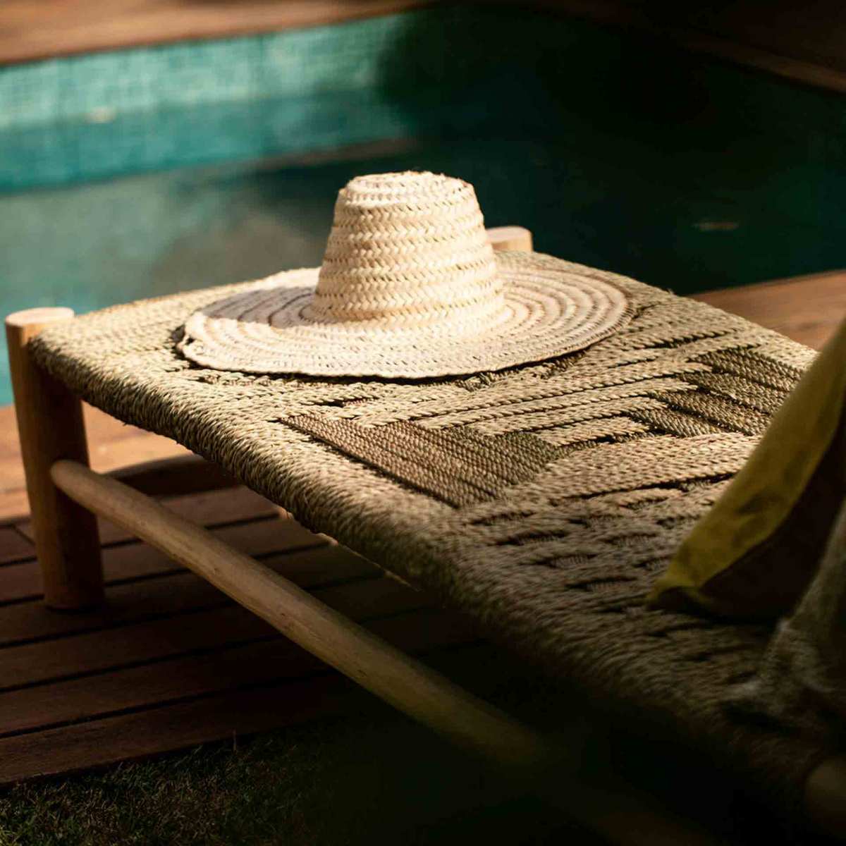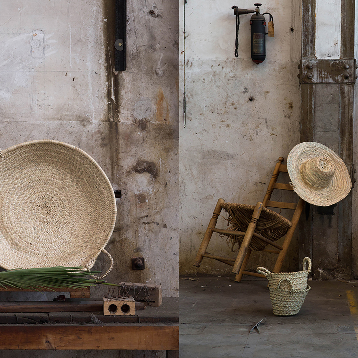 Hoja de palma (Chamaerops humilis). Palma enana, palmiche, palmito. Distintos nombres para referirnos al mismo elemento: la palma. De esencia humilde, no goza en decoración de la fama de otros materiales nobles. Y por eso, precisamente, nos gusta tanto trabajarla. Una especie vegetal autóctona de Europa que busca para crecer tierras calcáreas, el aroma del mar, el sol fuerte del mediodía; puro carácter mediterráneo.