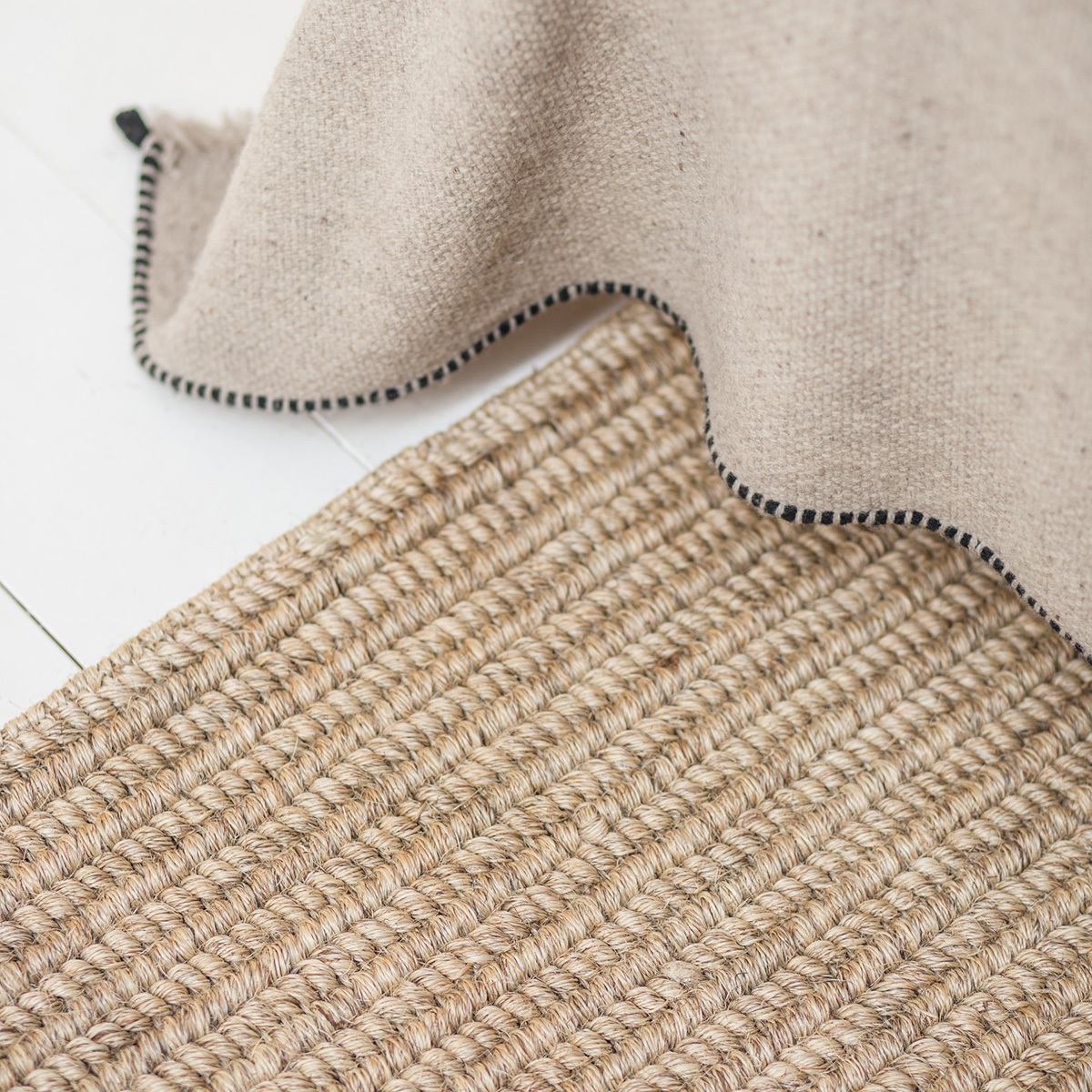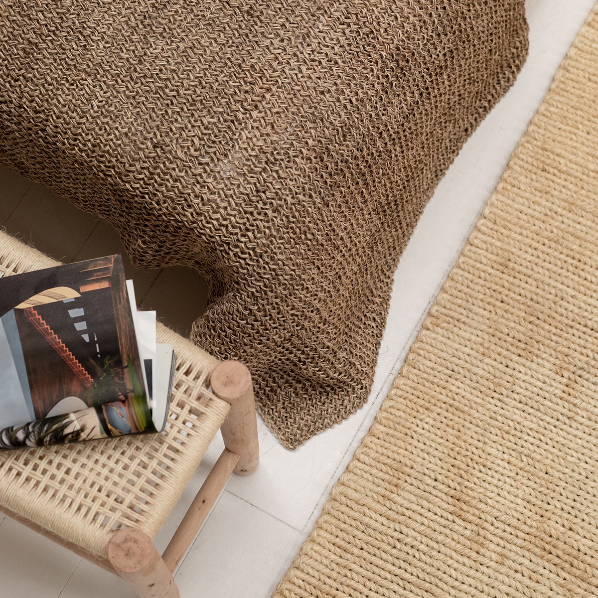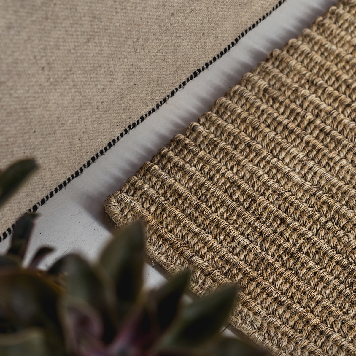 Alfombra rectangular de fique tejida en telar manual. Disponible a medida en todos los colores. Al estar tejida a mano su aspecto puede variar ligeramente de una pieza a otra. Gracias a la suavidad en su tacto con los pies descalzos, y a la posibilidad de tejerlo en varios colores, se puede usar en salones, dormitorios y entradas de la casa.