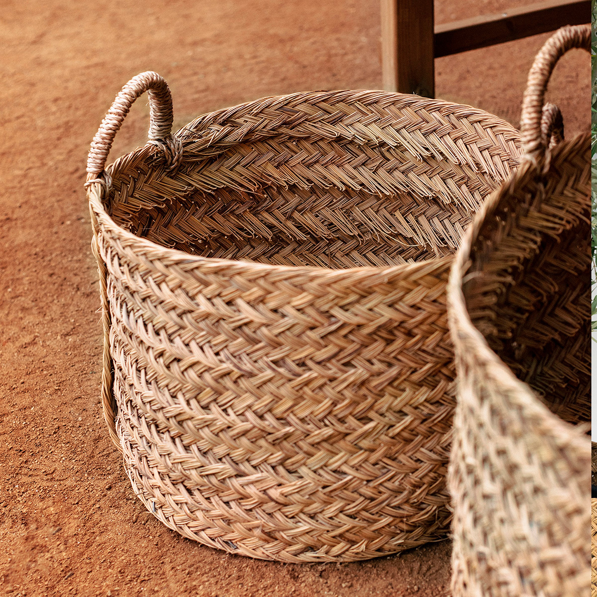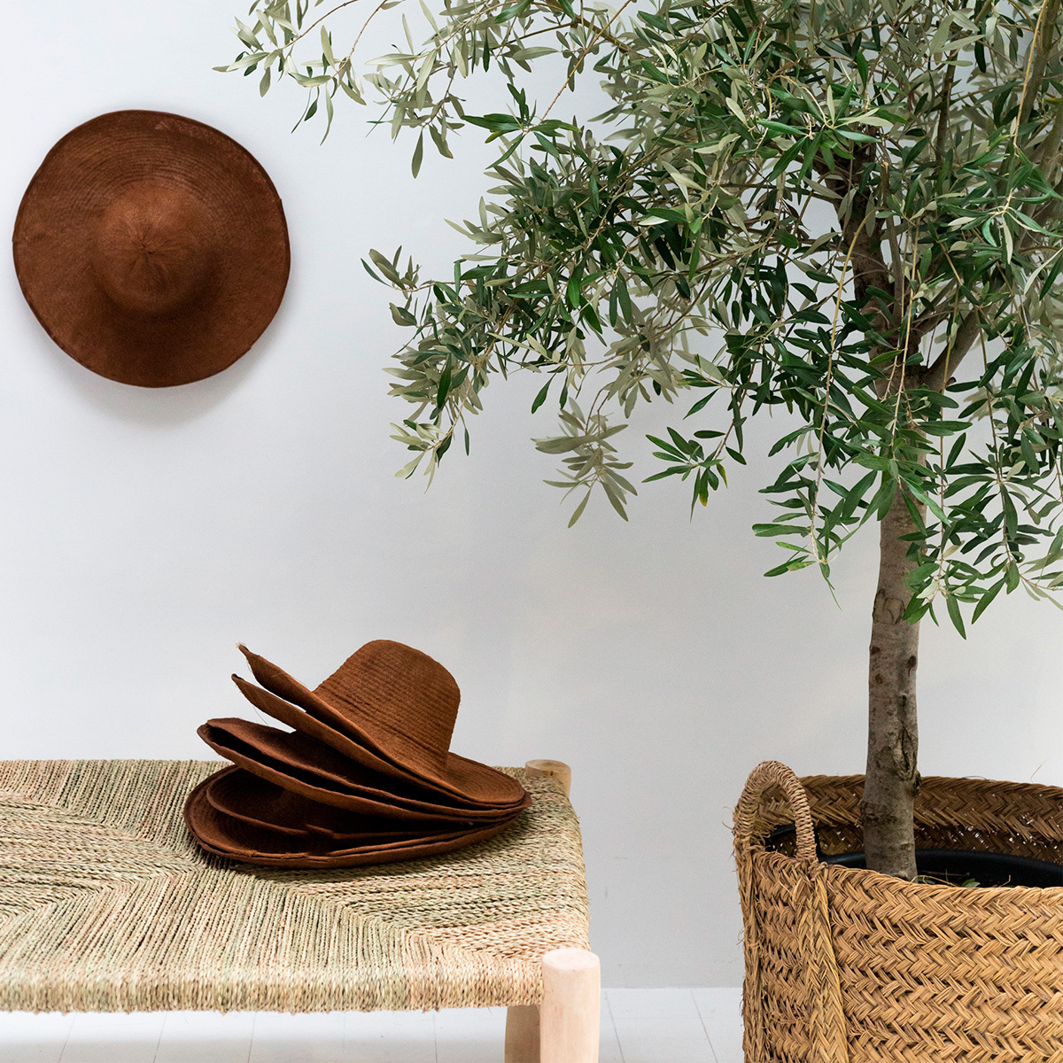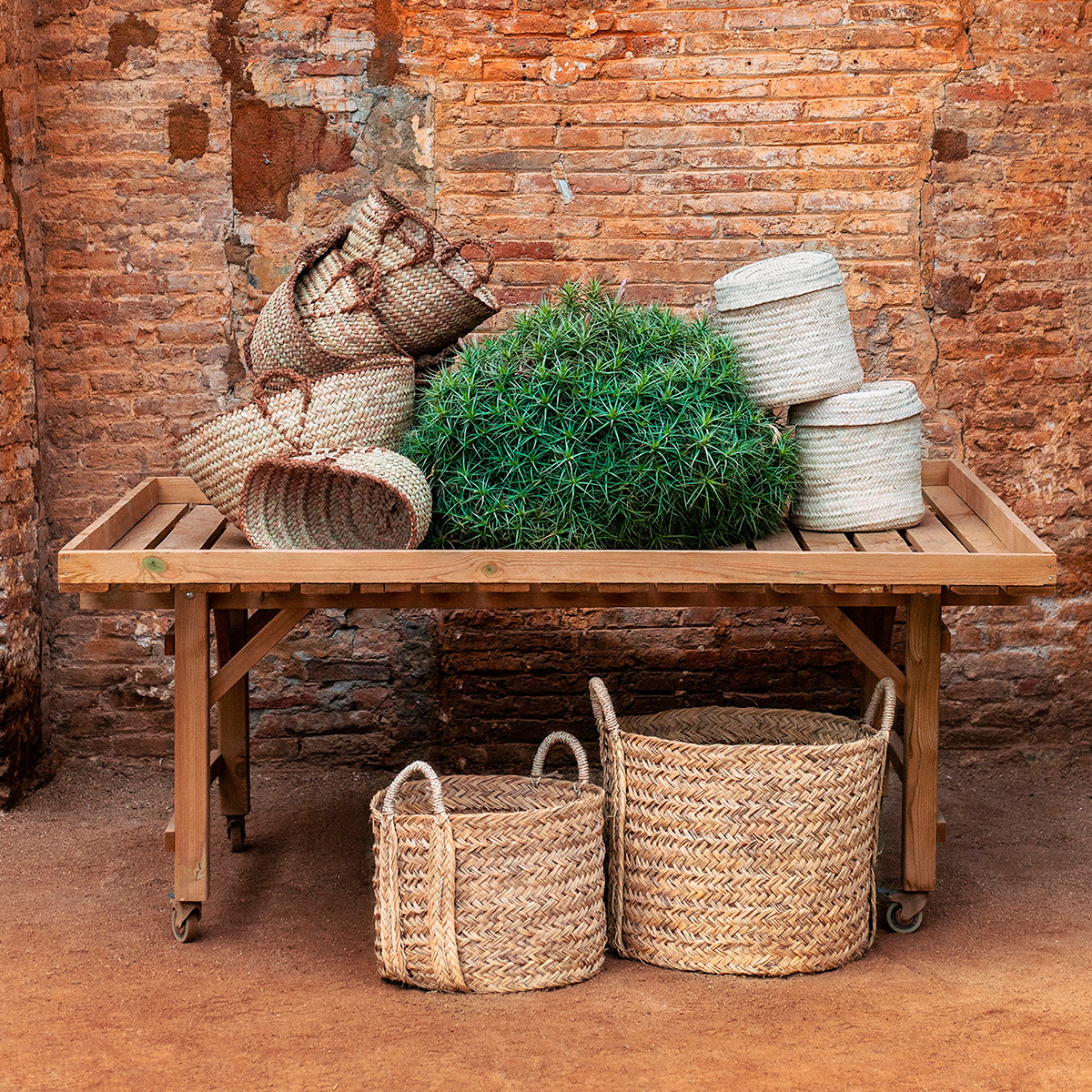 El esparto es trabajado por las manos expertas de nuestros artesanos y convertido en lámparas, alfombras, cestas, chaise-longues o cabeceros de cama. Cuatro técnicas diferentes aprendidas como antes se aprendían los oficios, acompañando al maestro, transmitiendo el arte poco a poco. Esta cesta está tejida en la técnica de pleita. Tejido de largas tiras de esparto crudo que luego se cosen con una aguja de madera.